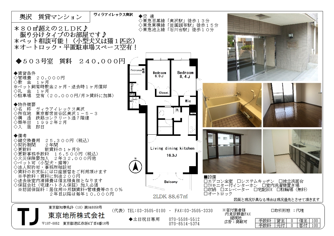 事務所使用の場合、賃料・管理費に別途消費税。敷金2ヶ月、退去時1ヶ月償却。